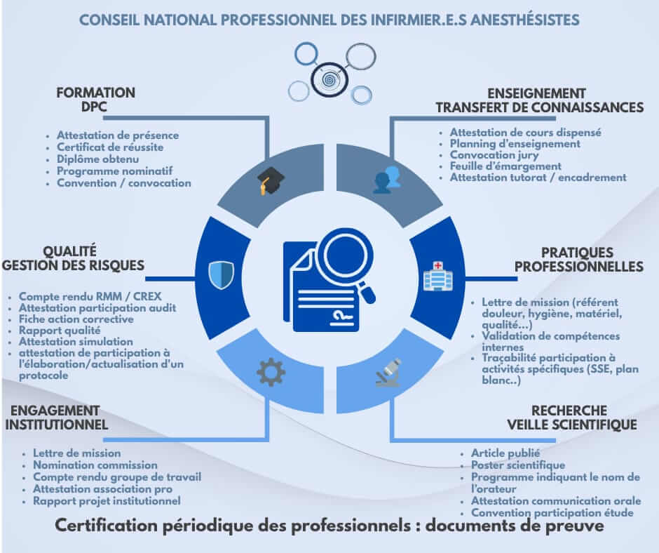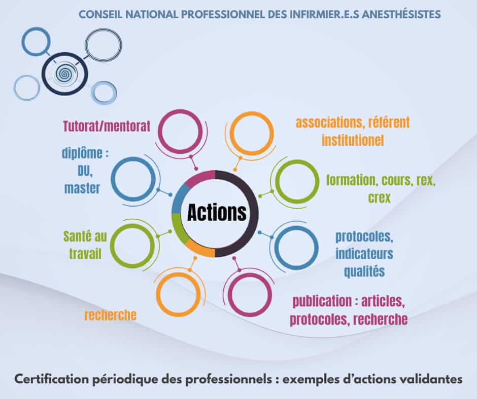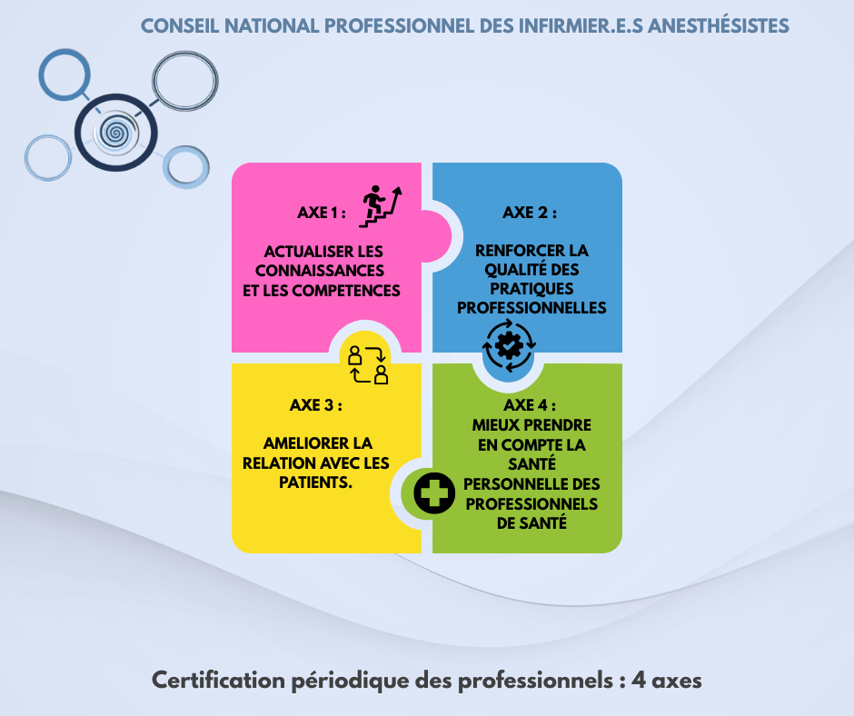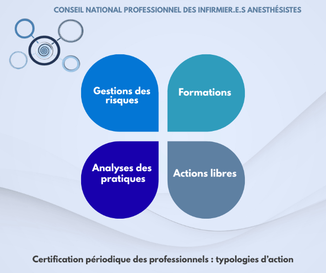 Le référentiel de certification périodique des IADE décline pour chacun des 4 axes des actions selon les spécificités de la profession.